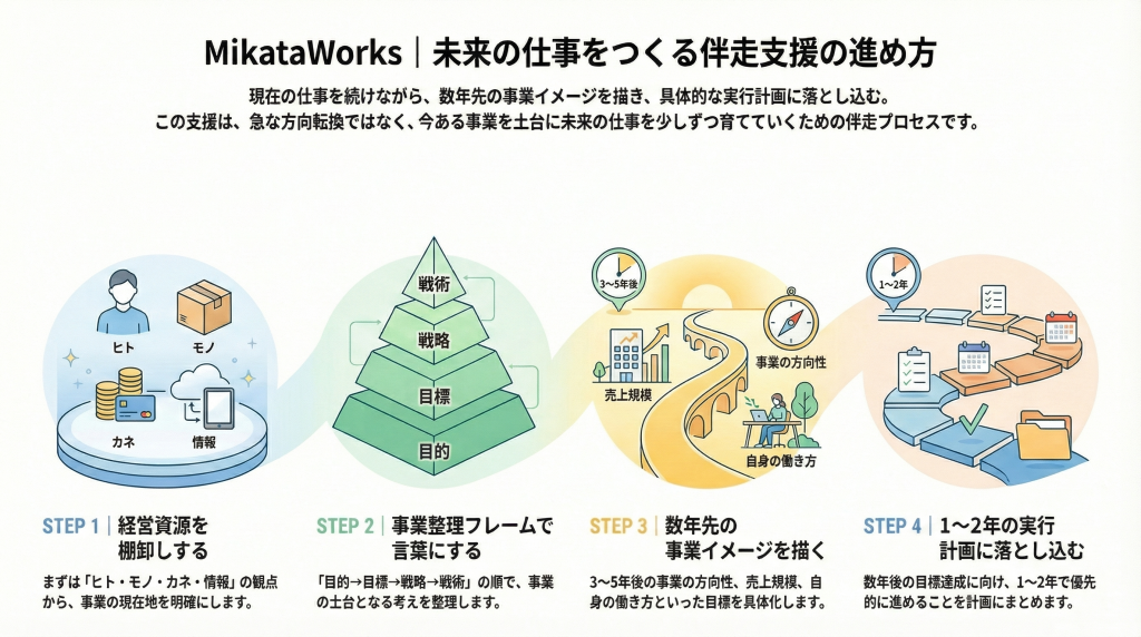 Mikata Worksの経営支援の全体像は、サービスページにまとめています。